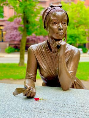 The Phillis Wheatley statue is one of three works of art by Meredith Bergmann at the Boston Women’s Memorial along Comm. Ave Mall in the Back Bay neighborhood.